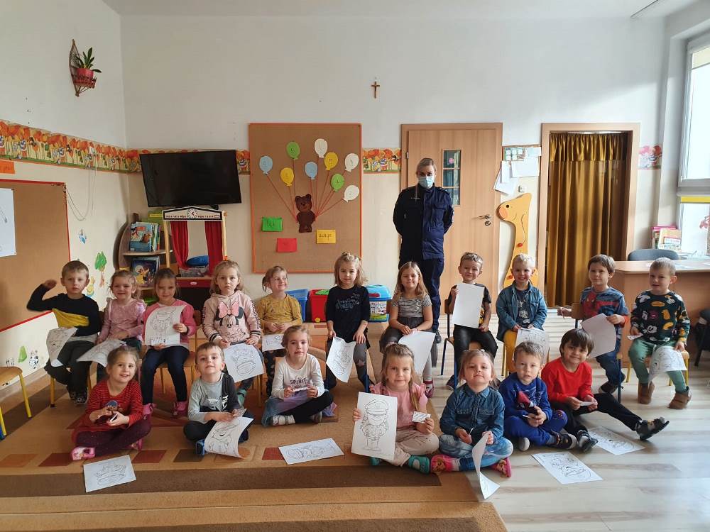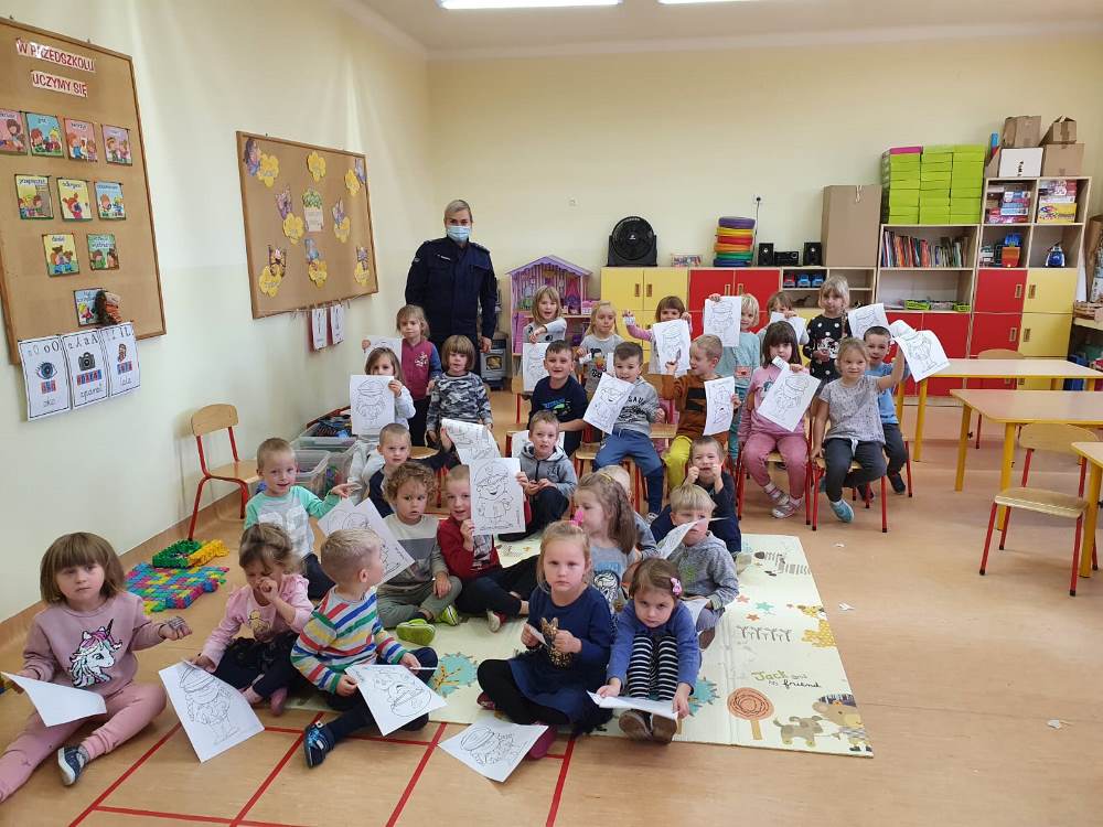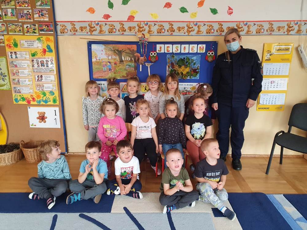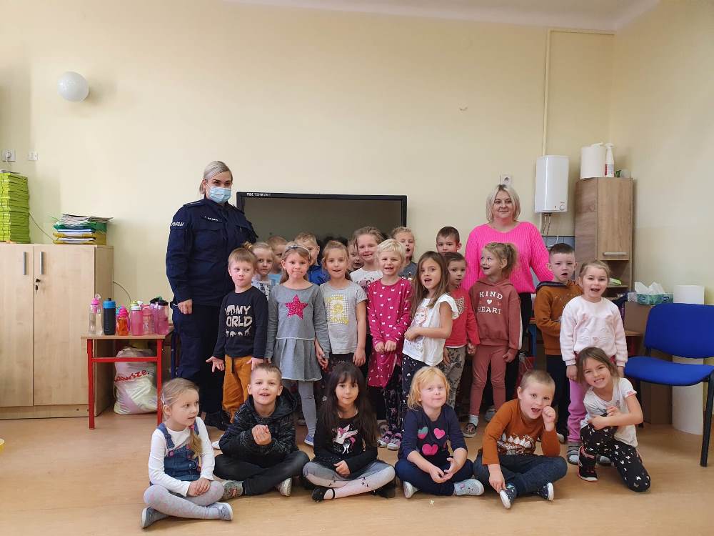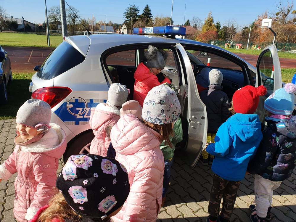 Przedszkolaki chciały wiedzieć, na czym polega praca policjanta i z jakich elementów składa się jego służbowe wyposażenie. Prowadząca udzieliła milusińskim kilku cennych wskazówek dotyczących bezpiecznego poruszania się po drodze i właściwych zachowań w domu. Podkreśliła, jak ważne dla własnego bezpieczeństwa jest noszenie elementów odblaskowych, szczególnie teraz w okresie jesienno - zimowym. Funkcjonariuszka pokazała, jak zachować się podczas spotkania z psem, który nie posiada właściciela. Na zakończenie dzieci mogły zobaczyć policyjny radiowóz wraz z jego wyposażeniem.