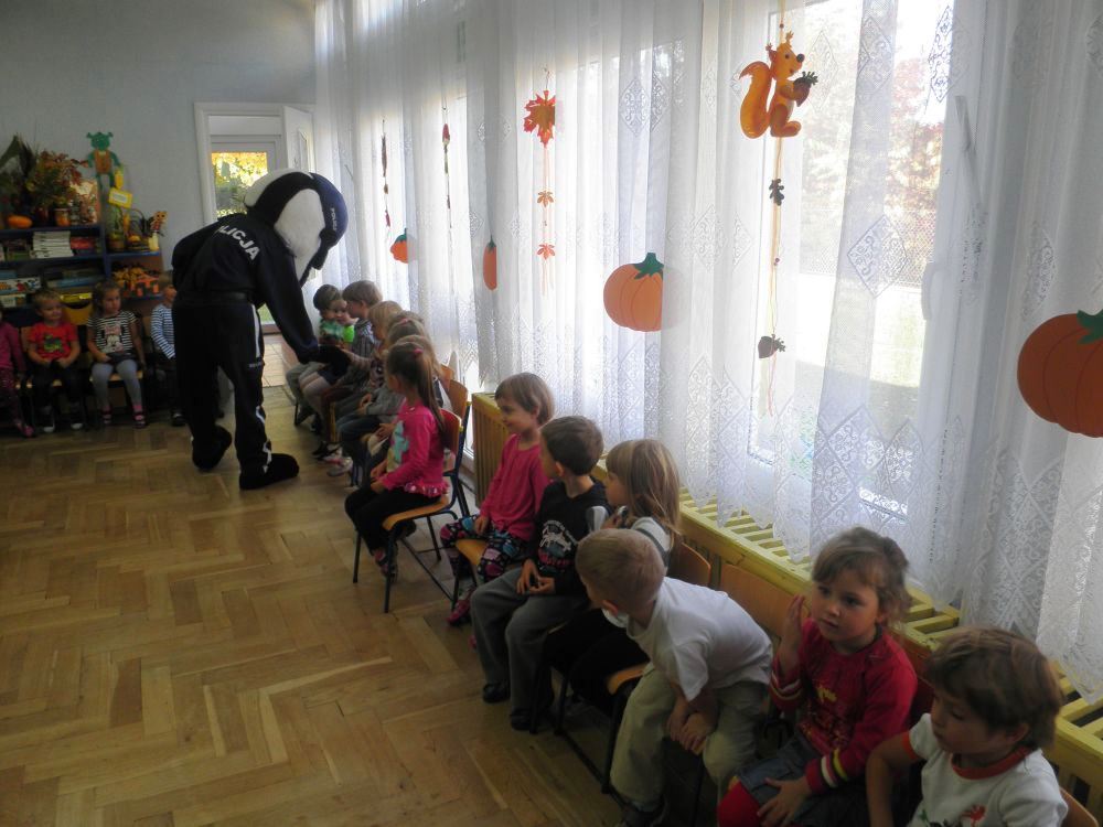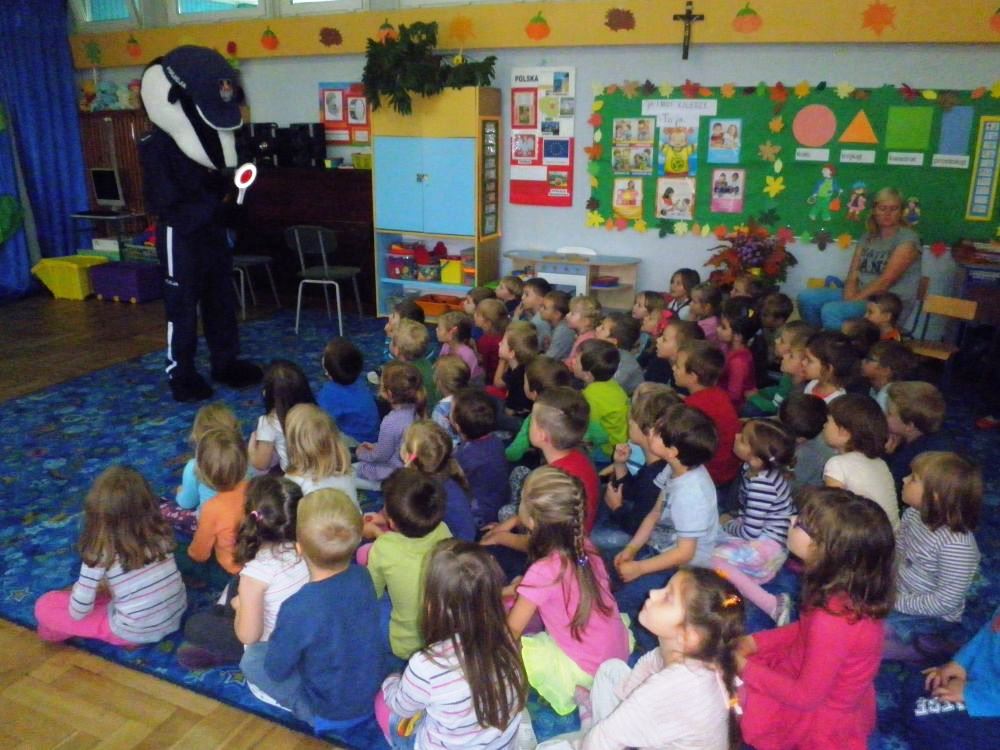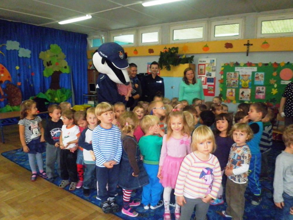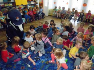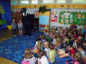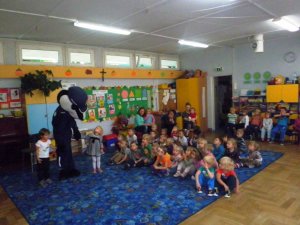 Policjantka z legionowskiej komendy odwiedziła dzieci z przedszkola w Chotomowie. W spotkaniu udział wzięła także maskotka Komendy Stołecznej Policji- Borsuk. Wszystkie grupy wychowanków przedszkola- 140 dzieci zapoznało się z zasadami bezpieczeństwa zarówno w ruchu drogowym jak i w miejscu zamieszkania. Wiele pytań najmłodszych dotyczyło pracy policjantów.