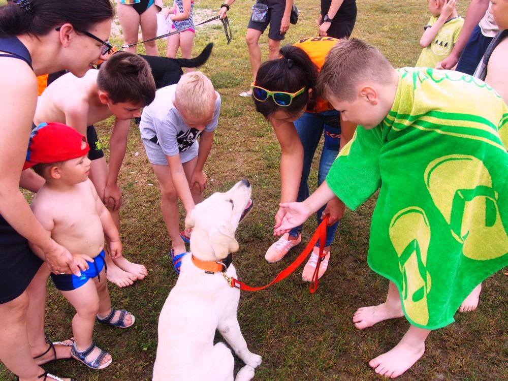 Następnie przedstawiciele sekcji poszukiwawczo -ratowniczej OSP w Jabłonnie wraz ze swoimi podopiecznymi – psami rasy Labrador opowiedzieli dzieciom o swojej pracy. Najmłodsi dowiedzieli się jak ratownicy wraz z pieskami prowadzą poszukiwania osób zaginionych zarówno na lądzie, jak i w wodzie. Dzieciaki instruowane były jak zachować się w lesie, podczas wakacyjnych wędrówek oraz co zrobić w przypadku zgubienia się. Przewodnicy psów opowiedzili również jak postępować z psem, aby nie zrobił nam krzywdy.