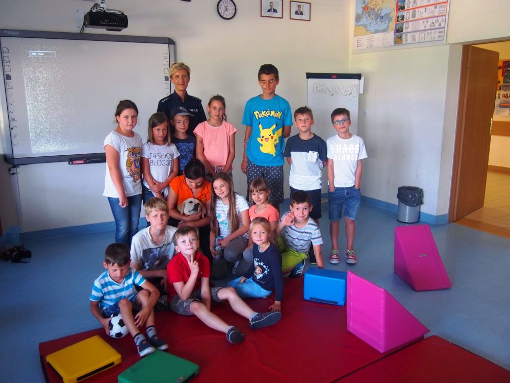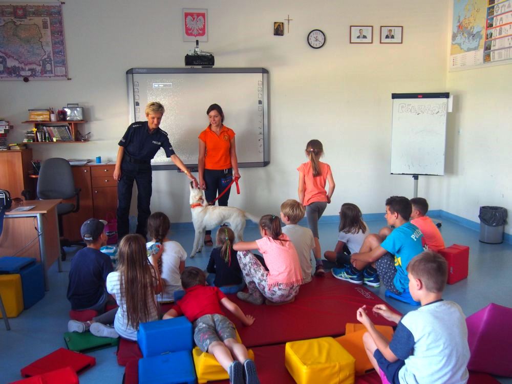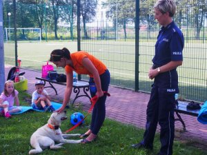 W ramach działań "Bezpieczne Wakacje 2017" specjalista ds. profilaktyki społecznej w legionowskiej komendzie- asp. szt. Justyna Stopińska na terenie powiatu legionowskiego podczas wakacji prowadzi zajęcia edukacyjno-informacyjne dla dzieci, które wolny czas od szkoły spędzają na półkoloniach. Tym razem cztery spotkania zostały przeprowadzone w gminie Wieliszew. Aby najmłodszych zapoznać z różnymi aspektami bezpieczeństwa policjantka na spotkania zaprosiła Emilię Malicką- przewodnika psa z sekcji poszukiwawczo- ratunkowej OSP w Jabłonnie wraz z jej podopiecznym: psem wabiącym się Regar.