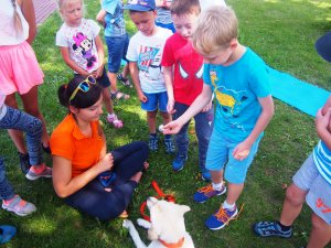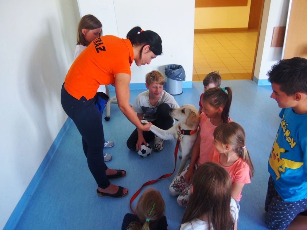 Następnie Emilia Malicka z sekcji poszukiwawczo- ratowniczej Ochotniczej Sytaży Pożarnej w Jabłonnie wraz ze swoim podopiecznym – psem rasy Labrador – o imieniu Regar opowiedziała dzieciom o swojej pracy. Najmłodsi dowiedzieli się jak ratownicy wraz z pieskami prowadzą poszukiwania osób zaginionych zarówno na ladzie, jak i w wodzie. Dzieciaki dowiedziały się jak zachować się w lesie, aby nie zgubić się i co zrobić, gdyby jednak taka sytuacja ich spotkała. Przewodniczka psa wspomniała również jak postępować z czworonogiem, aby nie zrobił nam krzywdy.
