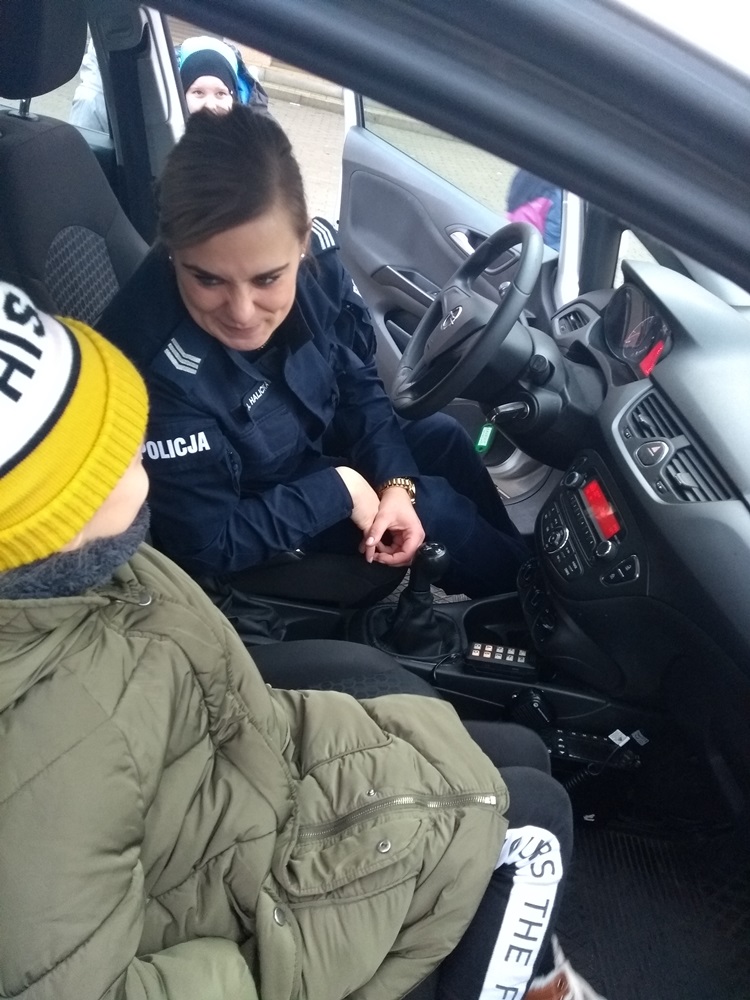 Dzięki temu spotkaniu uczniowie mieli również okazje zobaczyć z bliska policyjny mundur, dowiedzieć się na czym dokładnie polega służba w Policji. Interesujący okazał się pokaz kajdanek oraz pałki policyjnej. Podopieczni świetlicy mieli też okazję zobaczyć z bliska policyjny radiowóz.